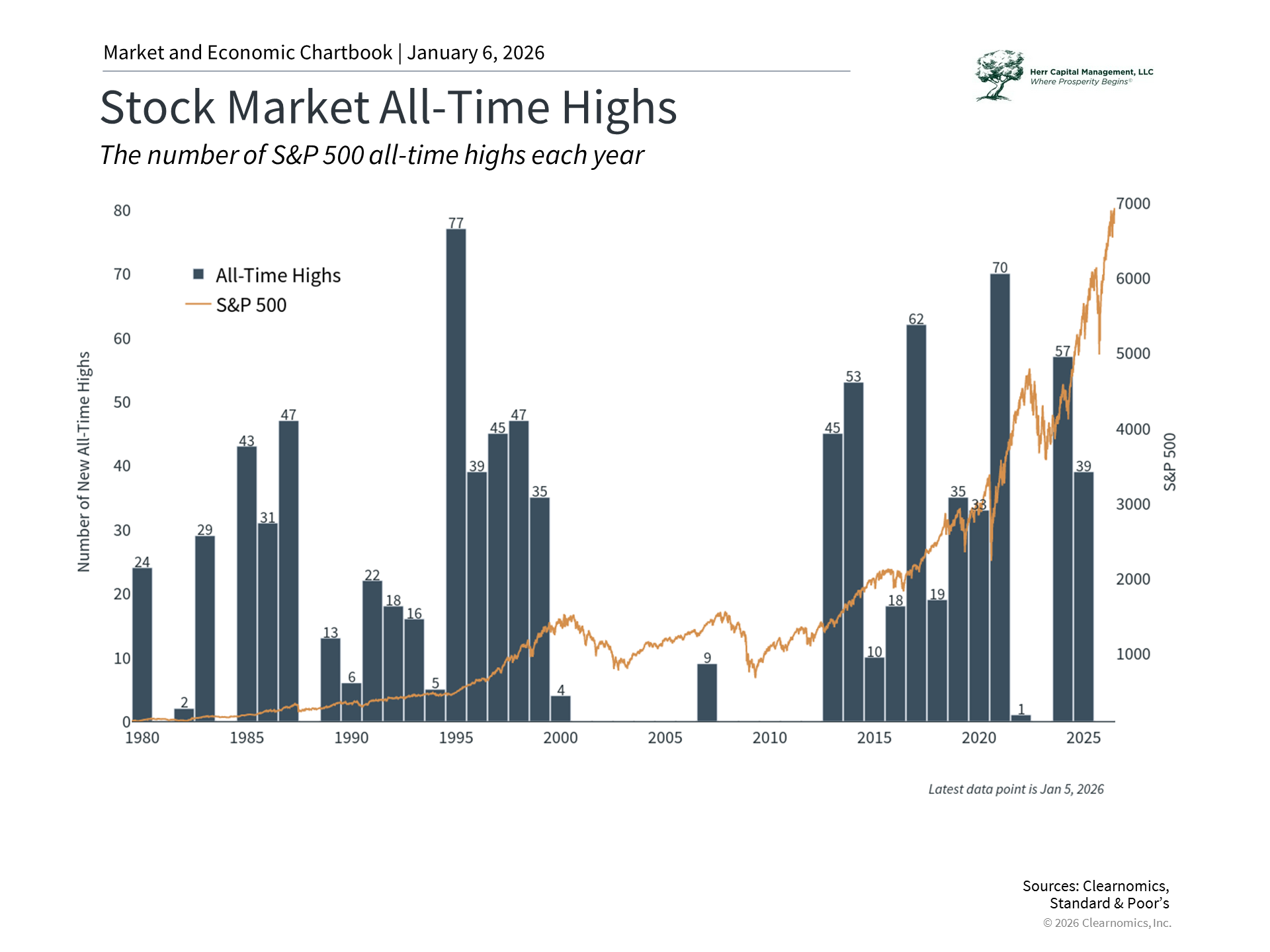 2025 was a historically strong year for markets despite the many events that took place along the way. The past year delivered no shortage of headlines including April's tariff announcements, ongoing developments in artificial intelligence stocks, the passage of the One Big Beautiful Bill Act, and more. Yet through it all, investors are likely happy as U.S. stocks rose to new record highs, international markets outperformed, and bonds continued their rebound. The S&P 500 has now generated double-digit returns in six of the past seven years and has nearly doubled in value since the market bottom in 2022.