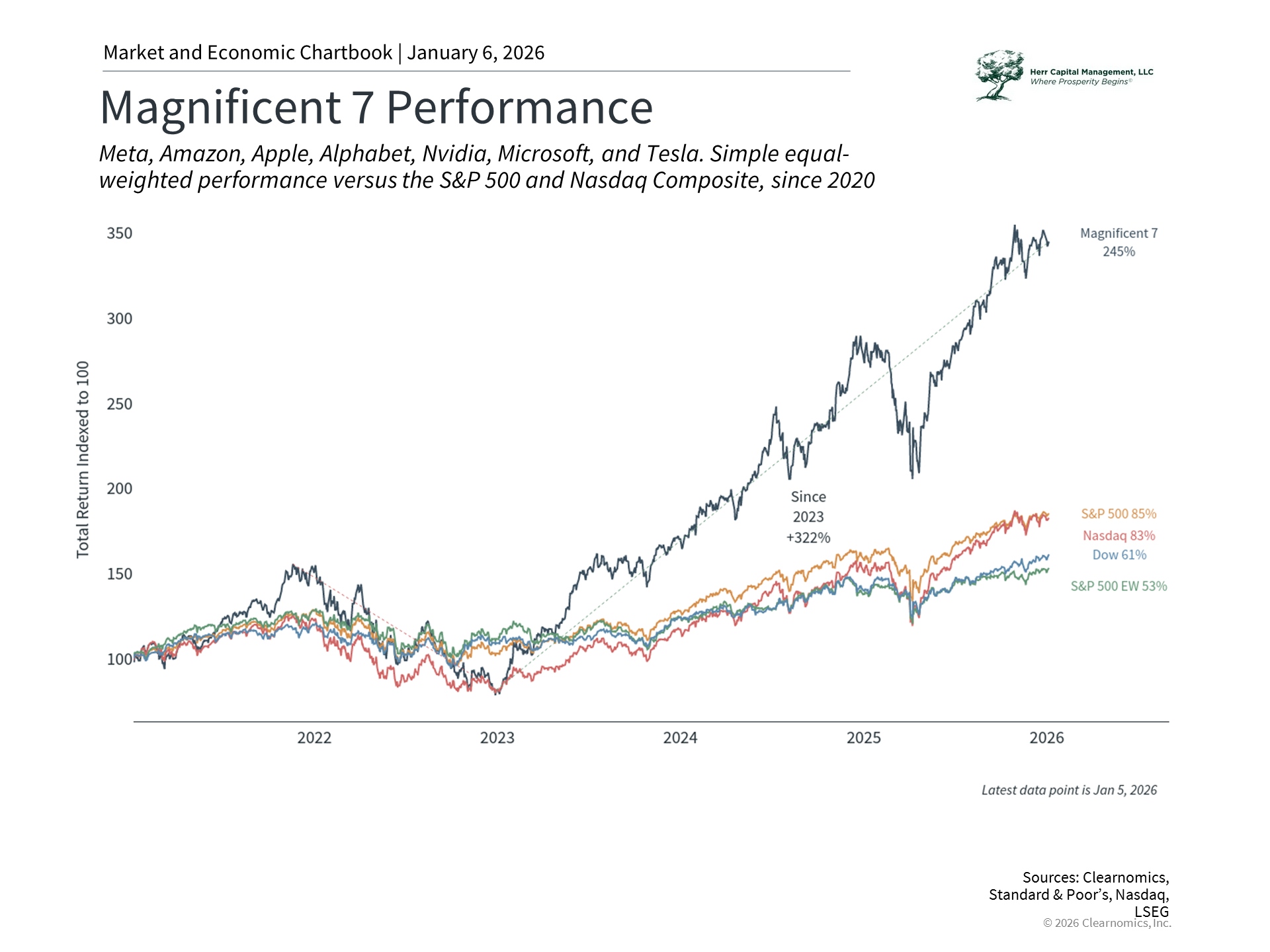 What themes drove markets across these events? First, it’s hard to miss the fact that artificial intelligence dominated market narratives throughout 2025. From massive infrastructure investments to concerns about market concentration, AI grew as an important source of economic growth and market returns. The Magnificent 7 stocks now represent around one-third of the S&P 500, creating concentration risk that means most investors have exposure to these stocks whether they realize it or not. Recognizing this when crafting investment strategies and financial plans will only grow in importance.