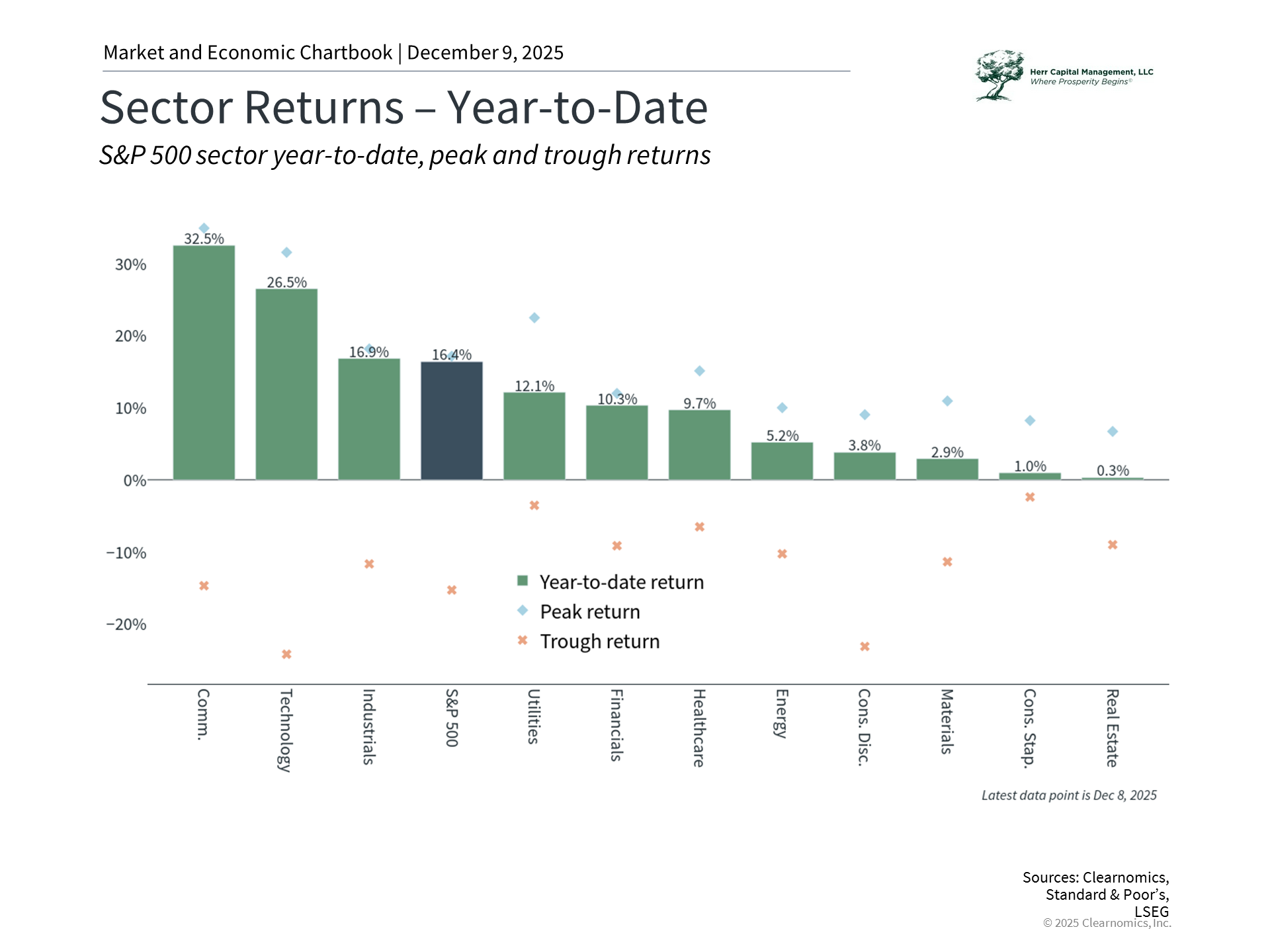 Fixed income is also playing an important stabilizing role in portfolios. The Bloomberg U.S. Aggregate Bond Index has gained 7% for the year as the Federal Reserve continues cutting interest rates and inflation stabilizes. Higher-quality bonds have been serving their purpose by providing income and offsetting stock market volatility during periods of market uncertainty.