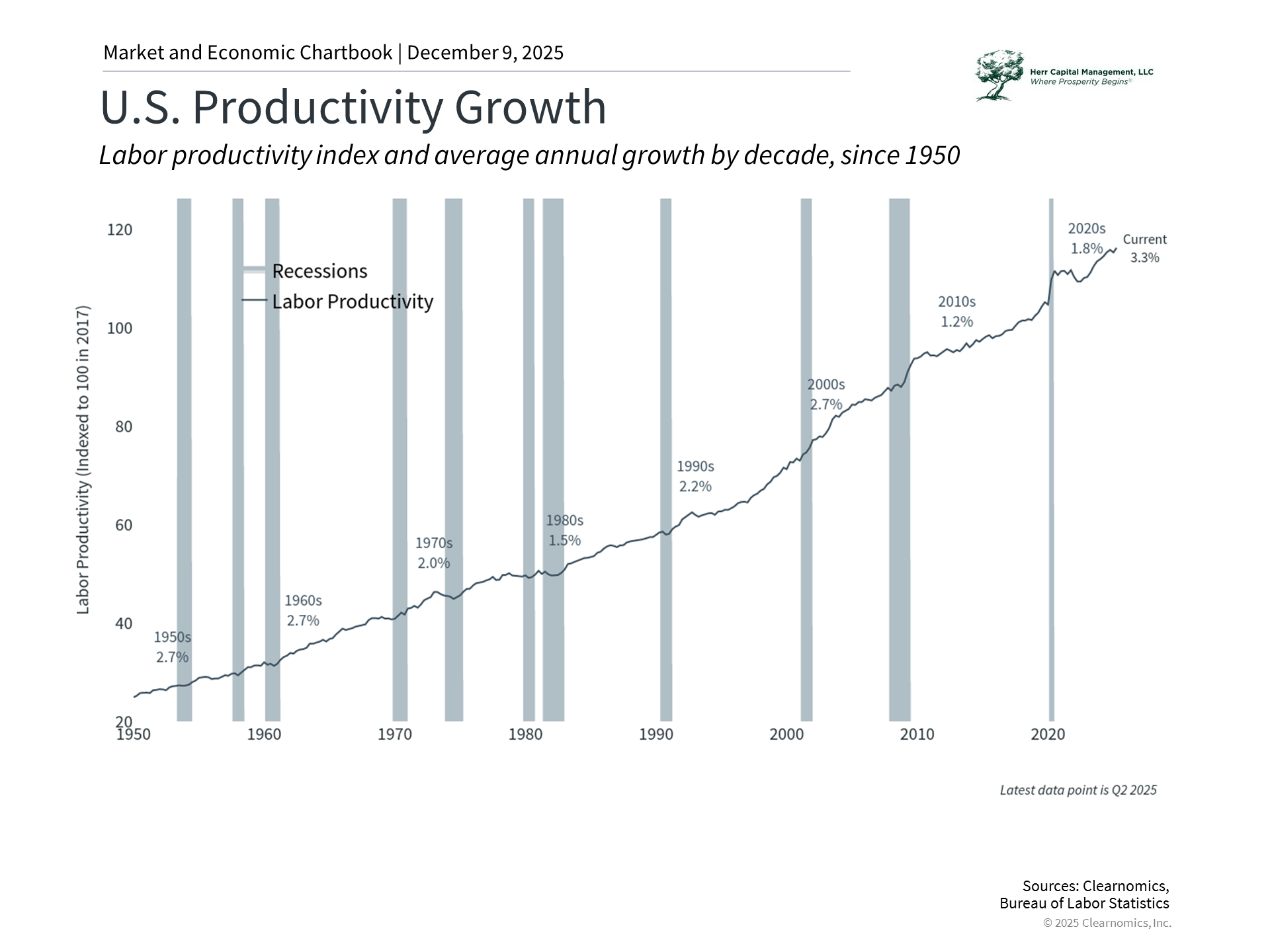 As the chart above shows, productivity growth averaged only 1.2% per year during the 2010s. The hope of AI and new technologies is a boost to worker output. However, this often takes longer than expected, and won’t necessarily benefit everyone equally. For investors, the promise of greater productivity is that profit margins can improve, supporting the broader economy and investor portfolios.