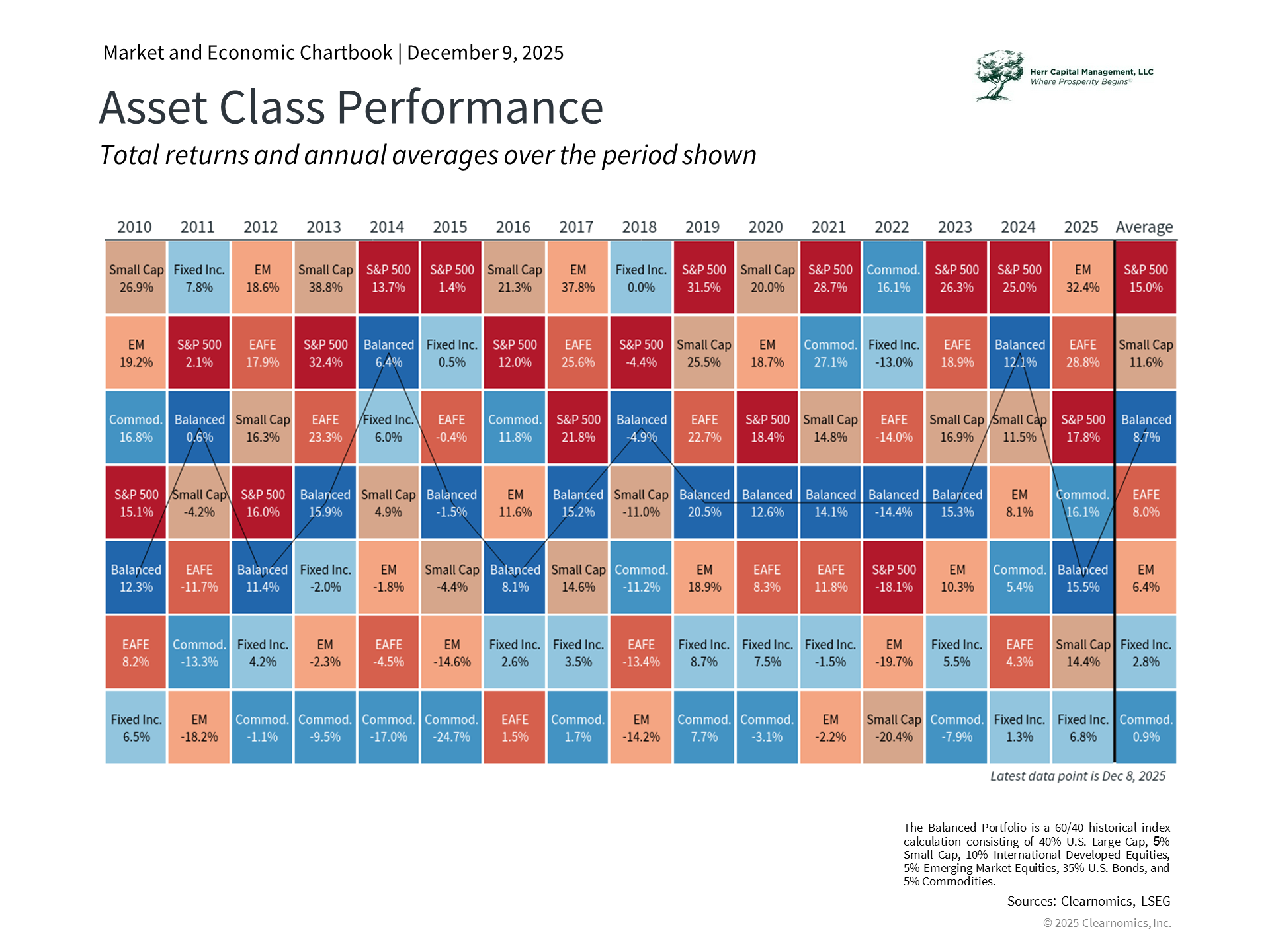 Importantly for investors, many asset classes are contributing to portfolio returns as we near 2026. This is in contrast to much of the past decade when U.S. stocks outperformed the rest of the world. In 2025, international stocks are outpacing U.S. markets, with developed market stocks (MSCI EAFE) and emerging market stocks (MSCI EM) each gaining around 30% in U.S. dollar terms. This has been driven by two key factors: improving growth expectations in many economies and the weakening dollar, which boosts returns for U.S.-based investors.