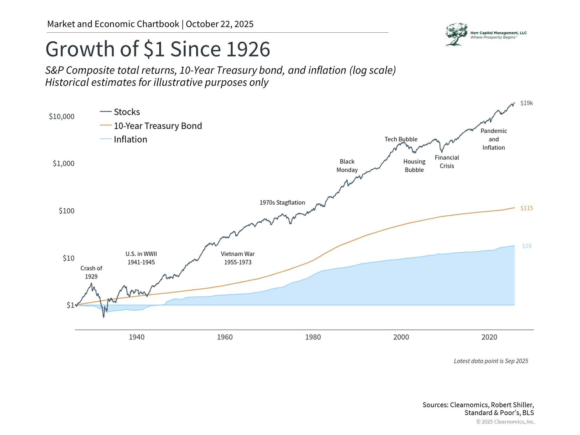 The history of financial markets is clear when it comes to growing the value of hard-earned savings and beating inflation. As shown in the chart above, stocks and bonds have risen magnitudes more than inflation. Even though what used to cost $1 in 1926 now costs $18 today, stocks and bonds have risen many multiples more, creating true wealth for those who were positioned for these long trends. This is true despite periodic market pullbacks, financial crises, and recessions over the past century.