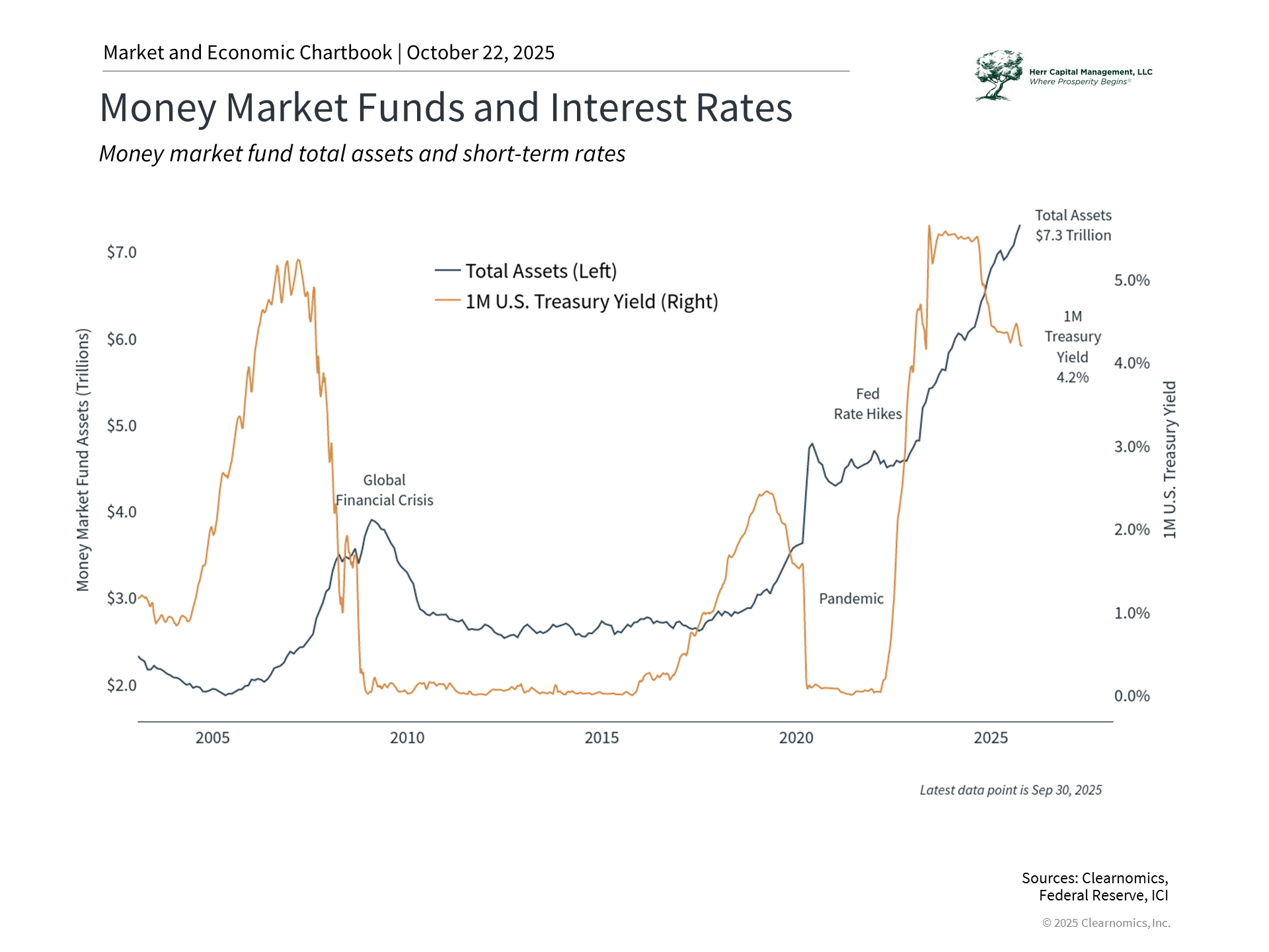 However, as rates have begun to moderate and are expected to decline further, these excess cash holdings could face reinvestment challenges. Investors who moved significant assets to cash when rates were temporarily high, or during periods of market stress, could face difficult decisions. This is often referred to as “cash on the sidelines,” and reflects the possibility that some investors may move back to stock and bond investments over time.