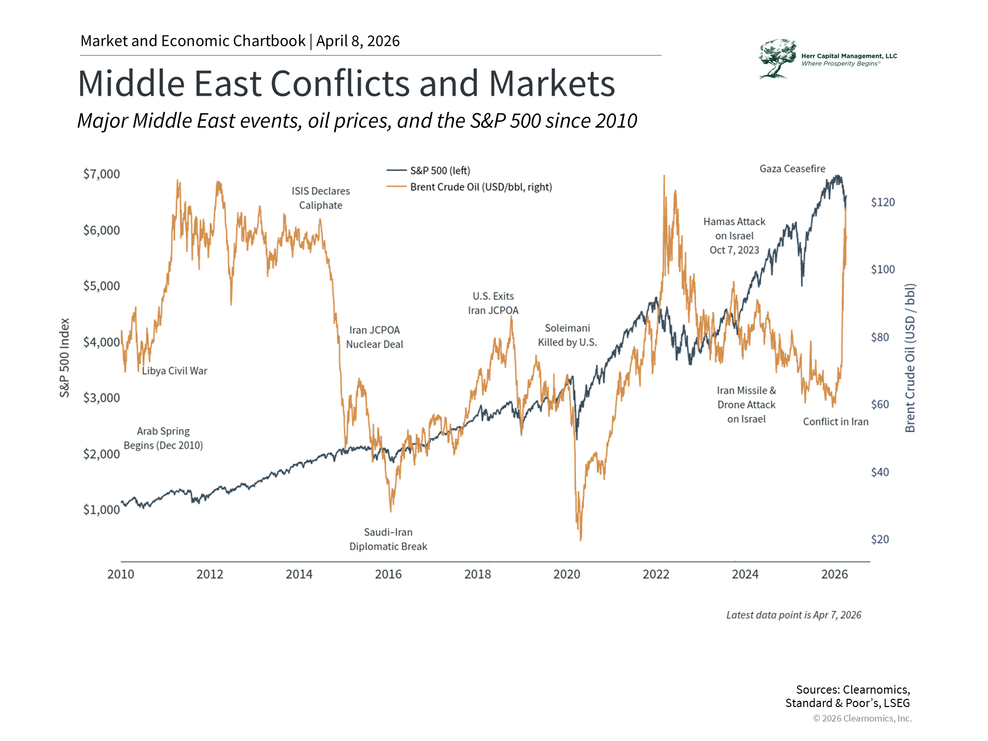 The chart below on Middle East conflicts and markets illustrates how geopolitical events have historically caused short-term volatility but rarely derailed long-term market performance, which is directly relevant here given the ongoing uncertainty around this ceasefire.