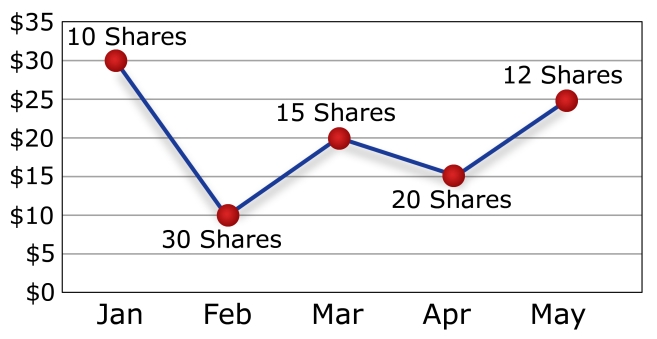 For example, let's say that you decided to invest $300 each month. As the illustration shows, your regular monthly investment of $300 bought more shares when the price was low and fewer shares when the price was high: