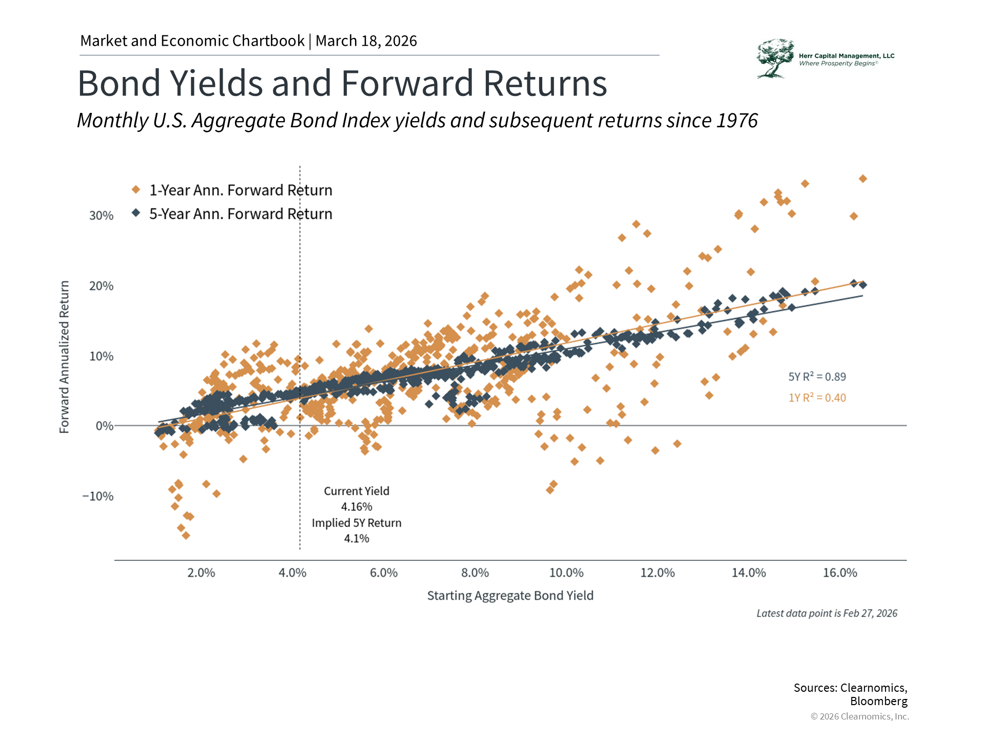 For long-term investors, bond yields remain attractive compared to the previous decade. Current bond yields offer meaningful income potential that was simply unavailable during much of the past decade. Specifically, the yield on the U.S. Aggregate Bond Index is 4.5%, well above the 2.9% average since 2009. Investing when yields are attractive is also historically correlated with healthy total returns, as shown in the accompanying chart.