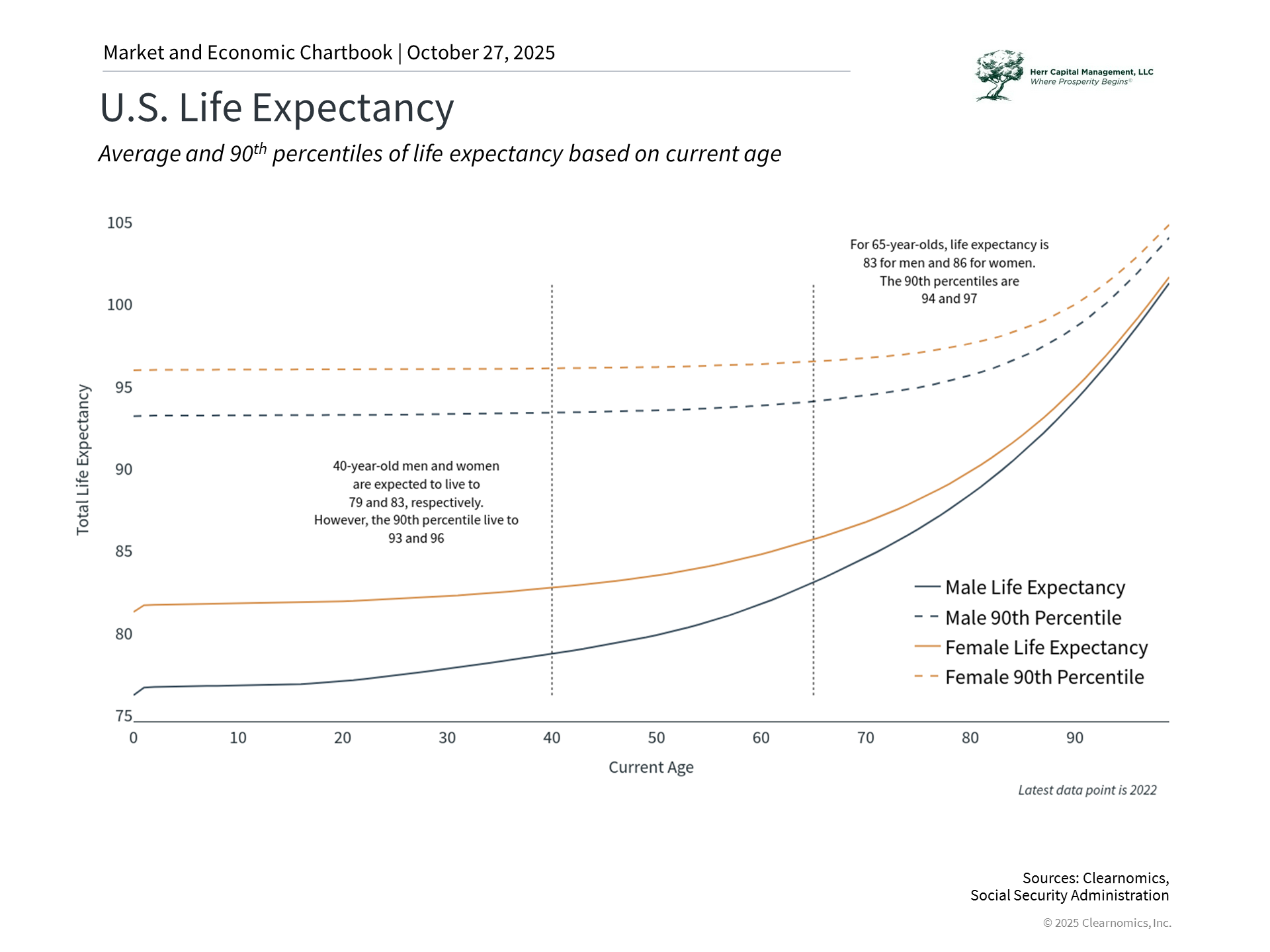 According to the latest Social Security Administration data, 40-year-old men and women have an average life expectancy of 79 and 83, respectively. However, for those who make it to 65 years of age, their life expectancies increase to 83 and 86. These are just averages - those in the 90th percentile could live to 94 and 97, respectively.