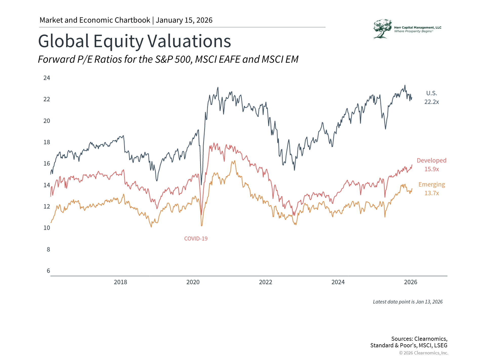 History shows that market leadership changes over time and is difficult to predict. As the chart above highlights, international markets currently trade at lower valuations than U.S. stocks, and thus can help improve the risk-reward characteristics of portfolios. Ultimately, investing isn't about maximizing returns in any single period, but about creating more consistent outcomes over full market cycles.